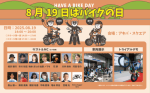 『8月19日はバイクの日 HAVE A BIKE DAY』が、今年も東京のアキバ・スクエアで開催されます。