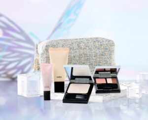『パピヨンプリズムコレクション』は、すべての女性が美しく輝けるようデザインされた冬の限定コフレです。花から花へと舞う蝶の美しさを表現したこのコフレには、見る角度によって偏光パールが繊細に輝く「パピヨンパール」を配合した化粧品が3種類含まれています。また、定番となっているBBクリーム「薬用スキンケアスクワBB」と冬らしい華やかなツイード素材のポーチもセットになっています。