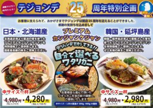 25周年記念企画として、北海道産と韓国・延坪島産の“プレミアムカンジャンケジャン”を特別価格でご提供いたします。