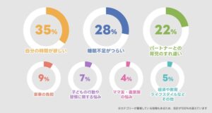 てつなぎに投稿された1万件以上の投稿を分析した結果、「しつけ・育児」が31%、「夫婦関係・人間関係」が23.3%、「家事」が9.2%と、育児に関わる幅広いテーマが寄せられていました。最も多いのは「自分の時間が欲しい」という切実な願いで、全体の約35%を占めています。