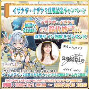新英雄キャラクター「イザナギ・イザナミ」のリリースを記念して、「天空のアムネジア」では鈴代紗弓さんの直筆サイン色紙をプレゼントするキャンペーンを開催中です。期間は2025年10月15日まで。ゲーム内でのプレイや公式Xのチェックをお忘れなく。
