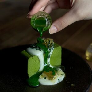 堀養蜂園の巣蜜(コムハニー)を贅沢に添えた「蜂蜜抹茶テリーヌ」は、自然の甘みと高級抹茶の深い旨みが溶け合う特別な一皿です。