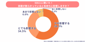 部屋の散らかりが気持ちに影響すると答えた人は92.8%にのぼり、ストレスや集中力の低下、家族との衝突など、様々な悪影響が報告されました。さらに、「最近ストレスを強く感じることがある」と答えた人も65.7%と高い数値を示しました。