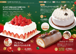 パンフレット掲載商品をご予約のお客様には、商品の本体価格の5%分のPLANT Pay限定ボーナスを還元し、クリスマスケーキ・アイスをご予約いただいたお客様にはソフトドリンク1本を進呈いたします。