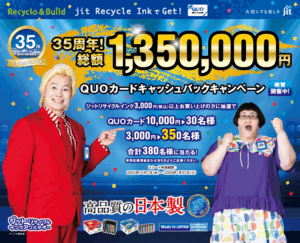 環境に貢献する使命を持つジットリサイクルインクが、ジット株式会社設立35周年を記念して「135万円 QUOカードキャッシュバックキャンペーン」を開始しました。