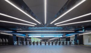 門型照明は、異なる空間をつなぎ、境界に象徴性を作り出す日本の伝統的な空間演出手法に基づいています。光をくぐり進むことで、時間や空間を移動するような体験や期待感を演出するとともに、「直観的に誰でも分かる」誘導も兼ねる未来への玄関口を表現しております。また、地下駅に時間の流れを表現させるため、調光・調色機能を取り入れ、時間軸に合わせて光の色が変化するよう細かく制御しています。これにより、始発から終電まで時間に応じた照明演出を実現しました。さらに、メンテナンス性や更新性を考慮し、天井のパネルの間に独立した照明と設備スリットを交互に配置し、複雑に見える折り紙天井をシステム化しています。このライン照明で構成した計画は、かつての御堂筋線の直管蛍光灯をなぞらえたものです。