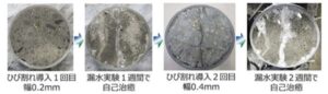 AH株と栄養素を添加したバイオスマートコンクリート(R)で作製した供試体で漏水実験を行った結果、繰り返し導入したひび割れが自己治癒され、漏水が止まったことを確認しています(写真1)。