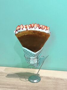 新商品のクレープの魅力は、薄く焼き上げる事によりサクサクとした食感に仕上げて、クリームとの相性をよくした点に尽きます。その代表商品が、「苺たっぷりクレープ」「贅沢チョコバナナクレープ」です。