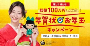 応募受付期間は、2025年11月20日から2026年1月12日までです。年賀状の裏面に「あなたが年賀状を送る理由」を書き添えて投稿してください。賞品は、200,000円分のデジタルギフト(1等)、10,000円分のデジタルギフト(2等)、1,000円分のデジタルギフト(3等)、そして特別賞としてエコリカちゃん/回収箱男MagSafe対応マスコットがあります。