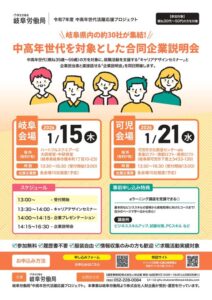 岐阜労働局イベント事務局、「中高年世代活躍応援プロジェクト」が、35歳から59歳の方を対象に合同企業説明会を2026年1月に開催します。