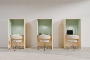 BOXデスクがオフィスやコワーキングスペースの新たな解答となります。高性能吸音材を採用したこのデスクは、正面・横方向で-15dB以上の防音効果を実現し、WEB会議や集中作業の邪魔をする雑音を気にせず、作業に集中できます。