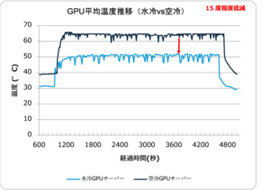 ・コンテナ型データセンター環境下で水冷GPUサーバーと空冷GPUサーバーの性能を比較した結果、最大負荷時のGPU平均温度が摂氏温度で15度程度低減され、CDU(冷却分配装置)等が適正に機能していることを確認