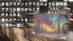 こちらのアートパネルの特徴は、様々な要素が組み合わさった独自のデザインにあります。AIが生成したビジュアルを活かしつつ、ステンドグラスの特色を表現。また全20種類と多彩なラインナップから選べ、AIとアクリル加工技術解釈により軽量かつ手に取りやすい価格での実現を可能にしました。