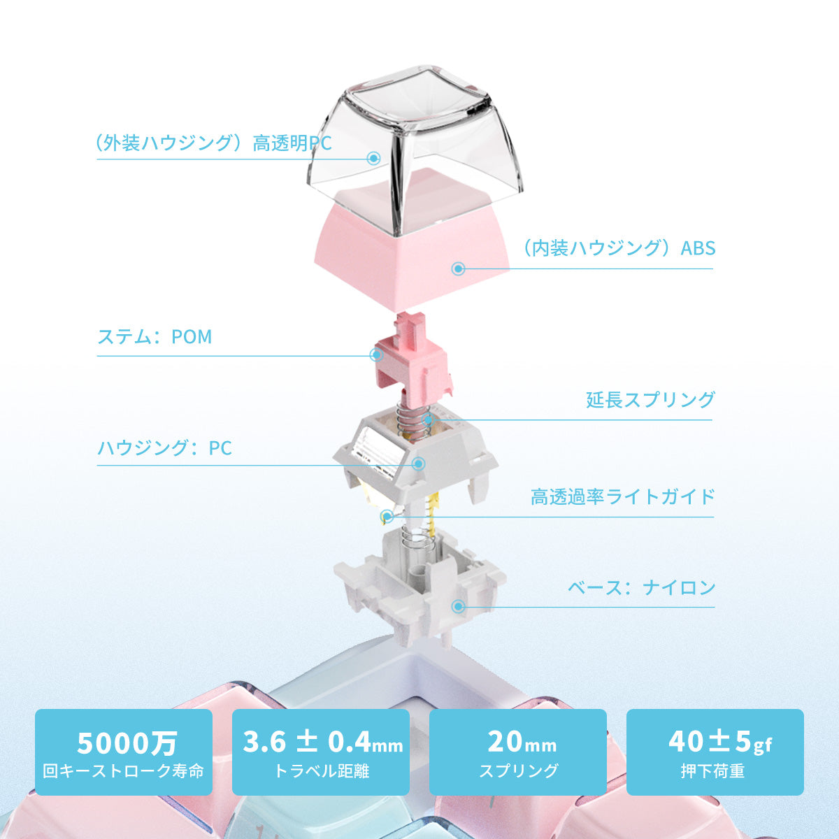 - 特注『Cherry Pink』スイッチ 搭載されているのは、リニアタイプの静音スイッチ。 押下圧40gという、とっても軽いタッチが特徴です。ネイルをしている指先でも疲れにくく、撫でるように入力できるので、長時間のゲームやチャットも快適そのもの!