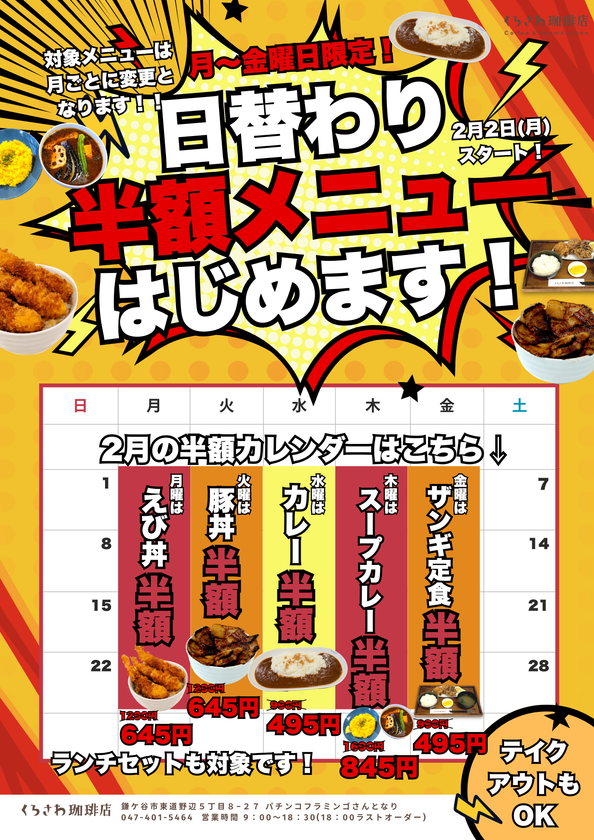 日替わりで人気メニューが半額に!?くろさわ珈琲店の日替わり半額企画が2月2日(月)からスタート!